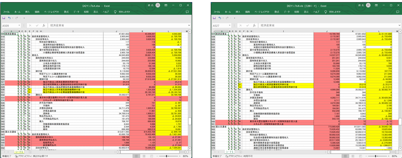 差分箇所が見やすいように、比較対象ファイルにもともと着色されていたセル背景色やフォント色などはクリアされます。