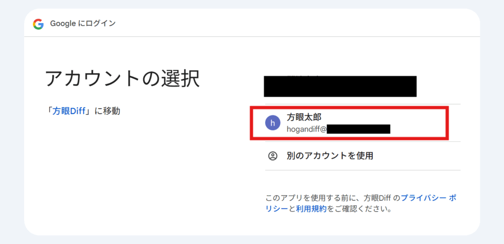 2. ブラウザが立ち上がり、Googleアカウント選択画面が表示されます。方眼Diffで利用するご自身のアカウントを選択します。