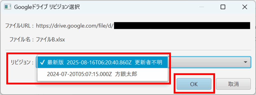 4. 続けて、リビジョン選択ダイアログが表示されます。Googleドライブ上に複数のバージョンが記録されている場合は、お好きなリビジョン(バージョン)を選ぶことができます。